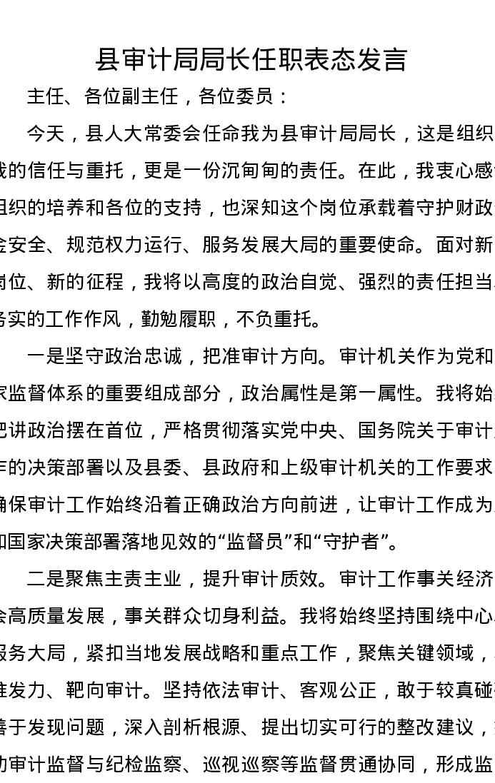 县审计局局长任职表态发言