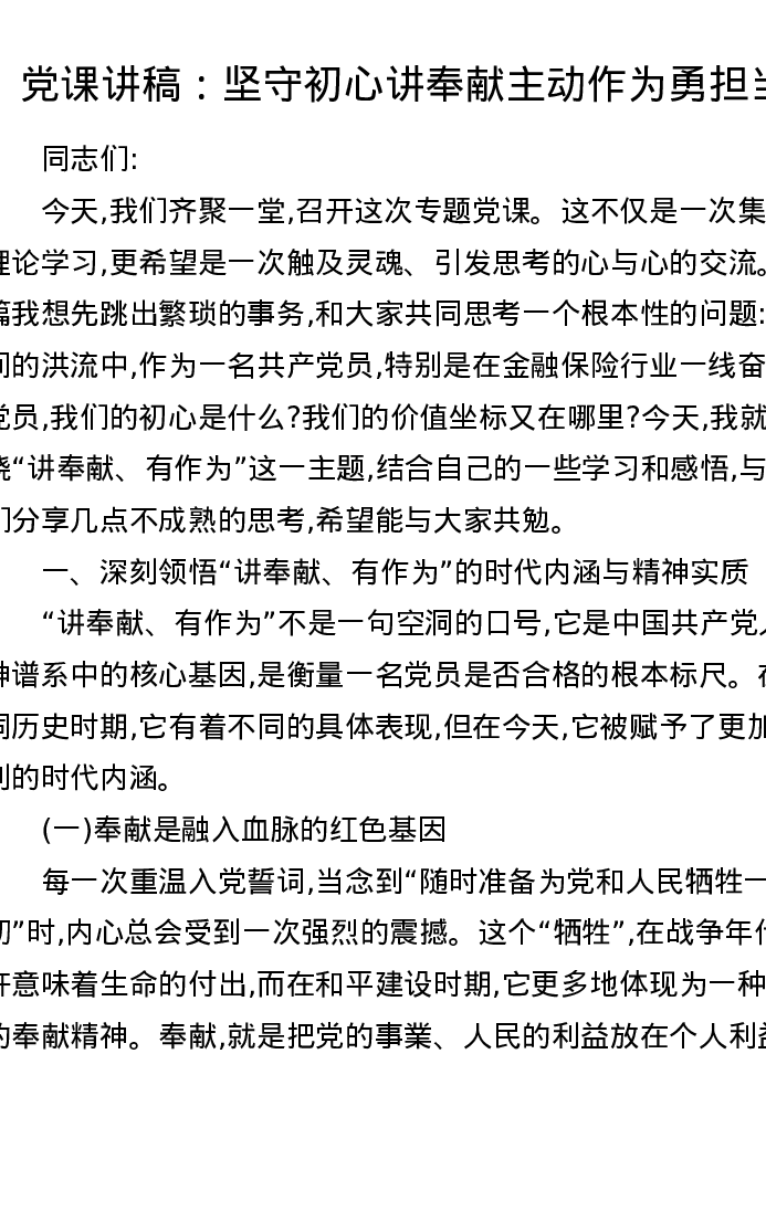 党课讲稿:坚守初心讲奉献 主动作为勇担当