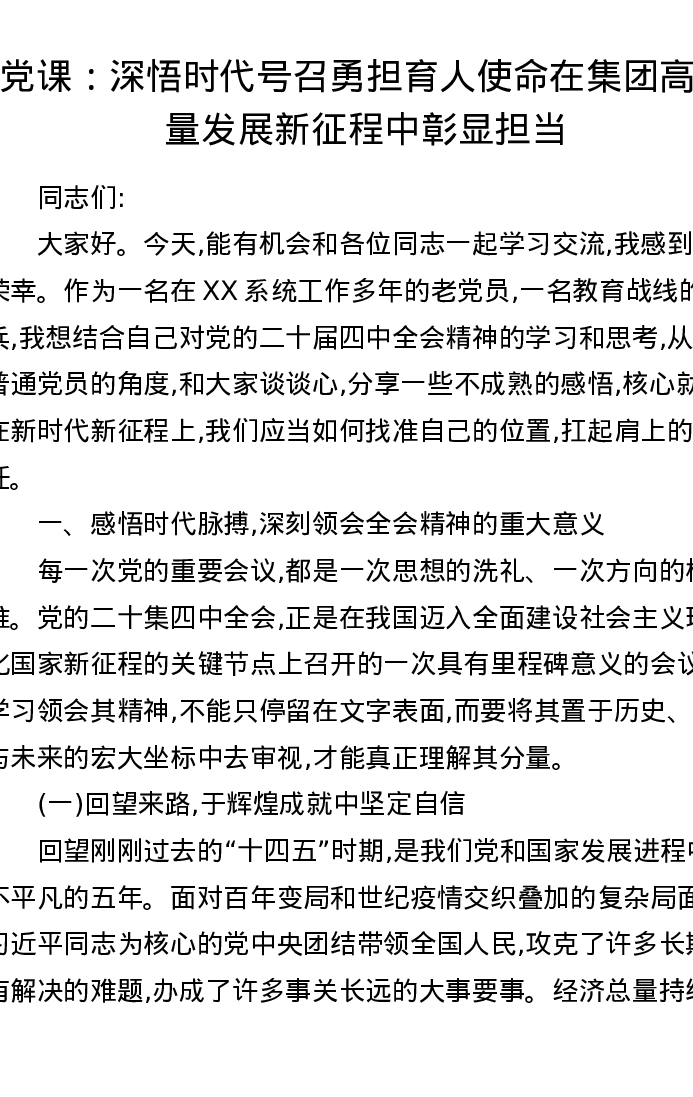 党课讲稿:深悟时代号召 勇担育人使命 在集团高质量发展新征程中彰显担当