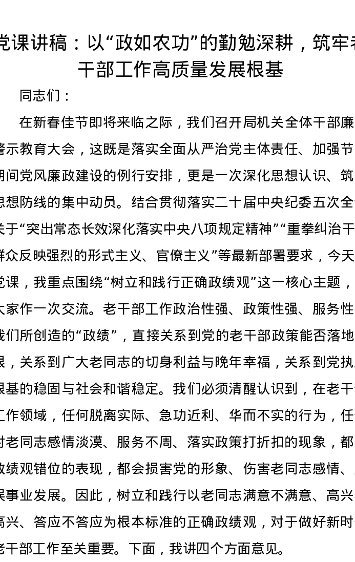 党课讲稿:以政如农功的勤勉深耕,筑牢老干部工作高质量发展根基