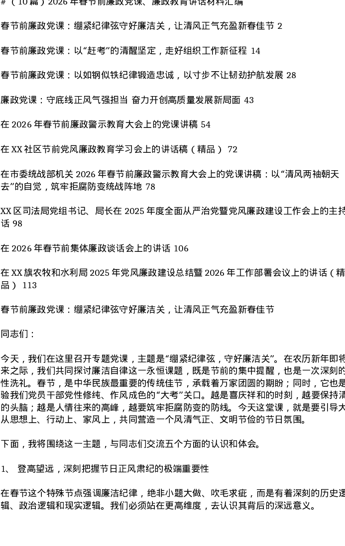 汇编:2026年春节前廉政党课、廉政教育讲话材料10篇