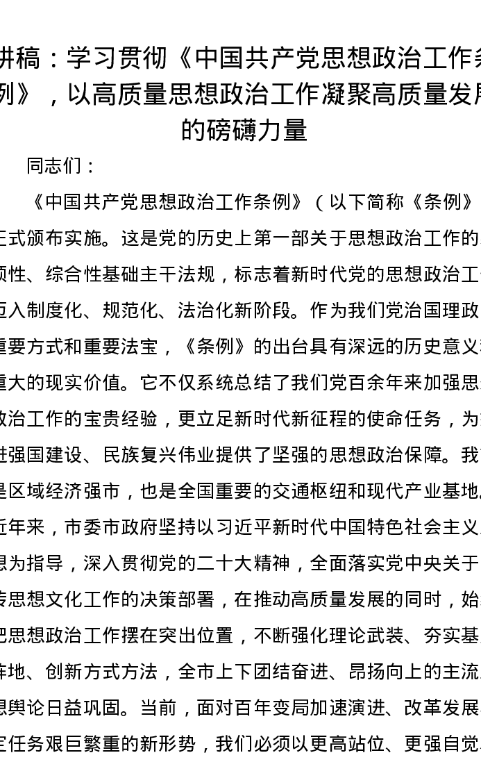 讲稿:学习贯彻《中国共产党思想政治工作条例》,以高质量思想政治工作凝聚高质量发展的磅礴力量