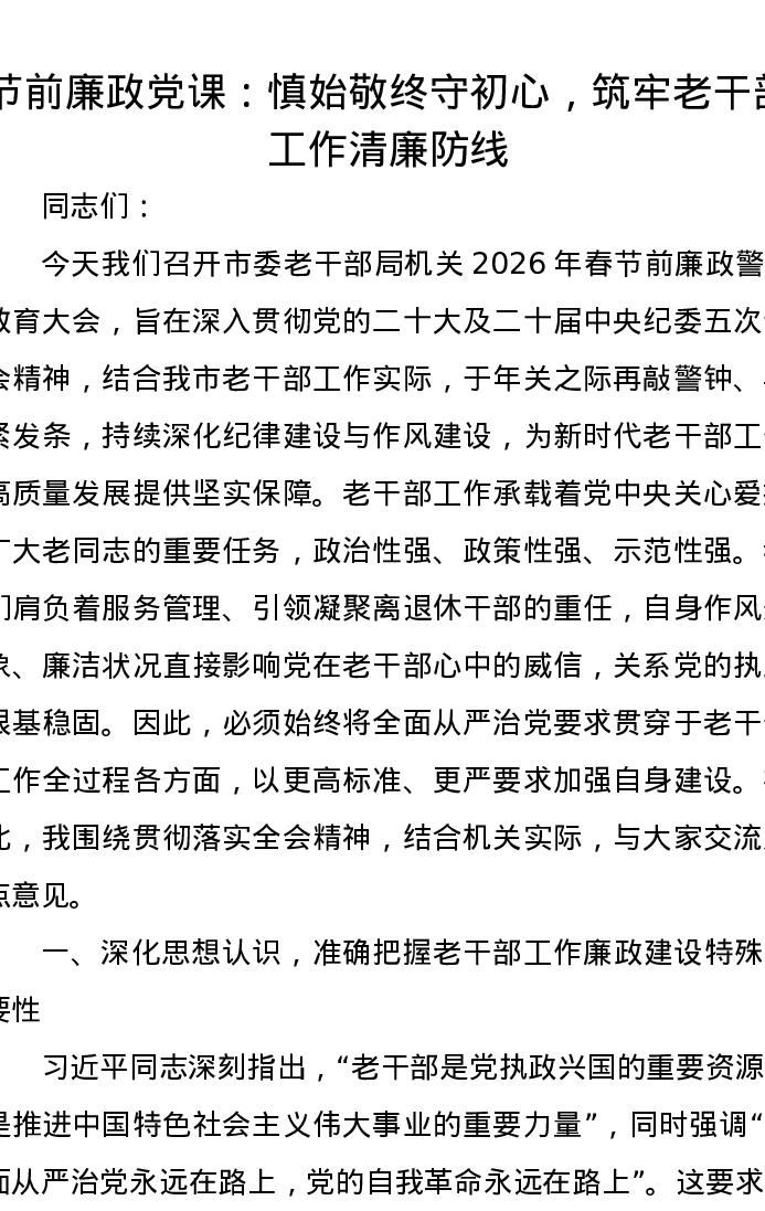 节前廉政党课:慎始敬终守初心,筑牢老干部工作清廉防线