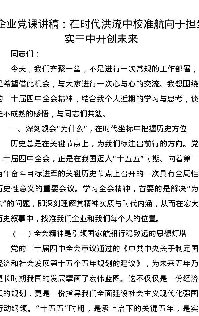 企业党课讲稿:在时代洪流中校准航向 于担当实干中开创未来