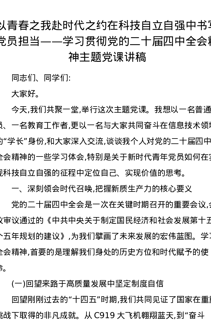 以青春之我赴时代之约在科技自立自强中书写党员担当——学习贯彻党的二十届四中全会精神主题党课讲稿