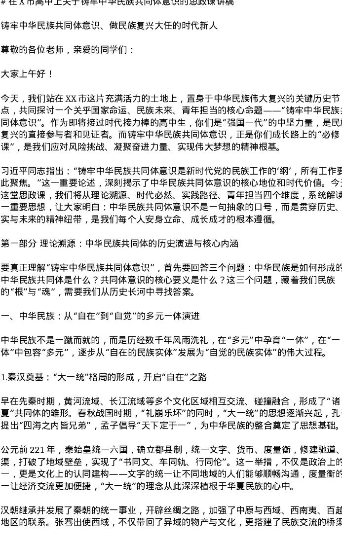 在X市高中上关于铸牢中华民族共同体意识的思政课讲稿