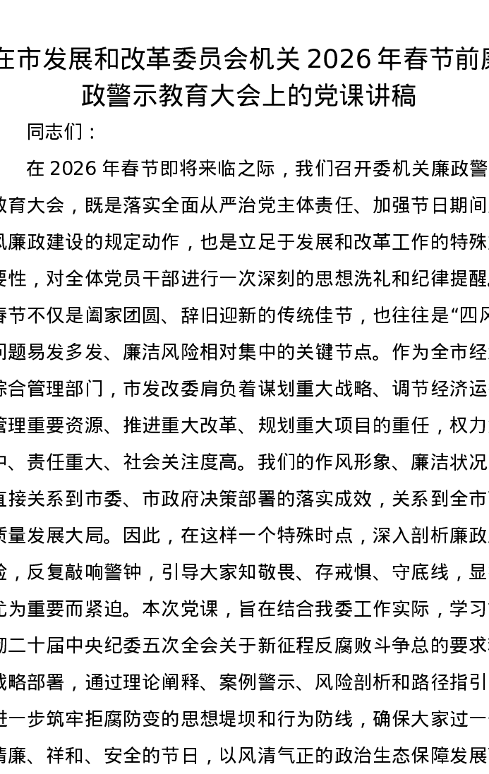 在市发展和改革委员会机关2026年春节前廉政警示教育大会上的党课讲稿