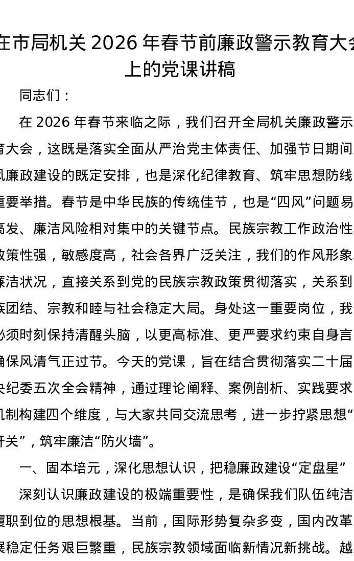在市局机关2026年春节前廉政警示教育大会上的党课讲稿