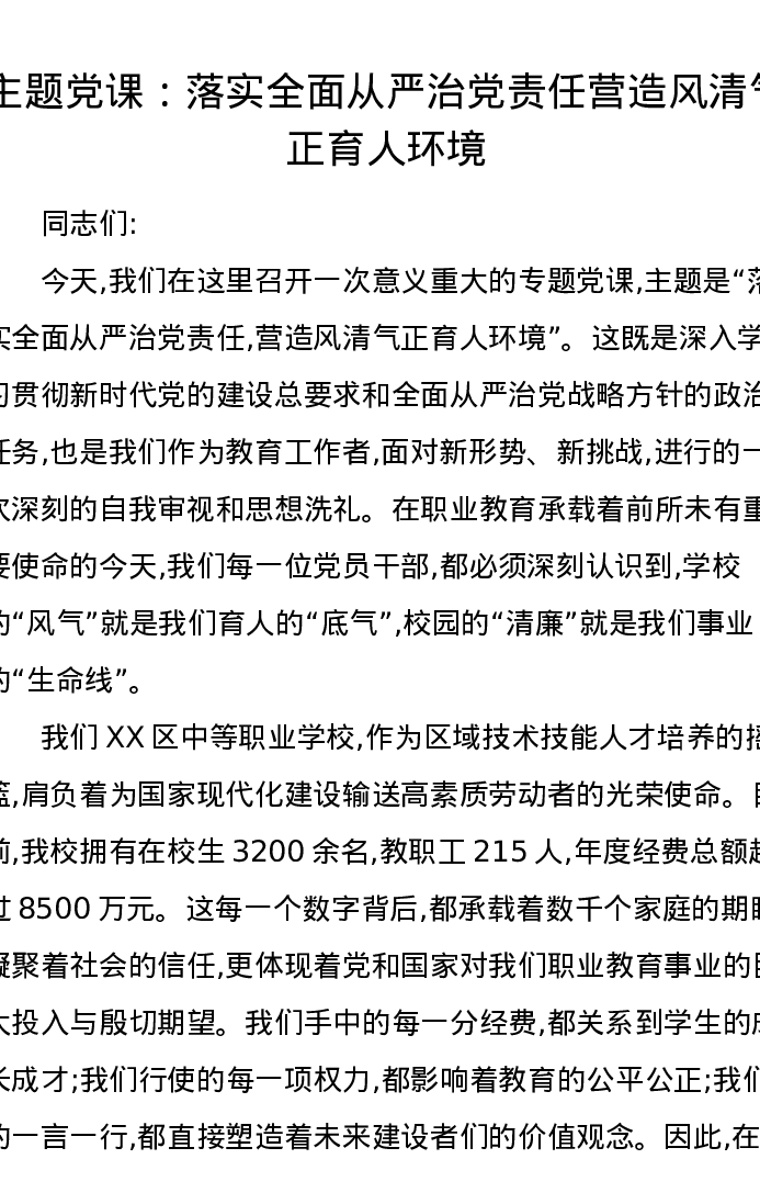 主题党课:落实全面从严治党责任营造风清气正育人环境