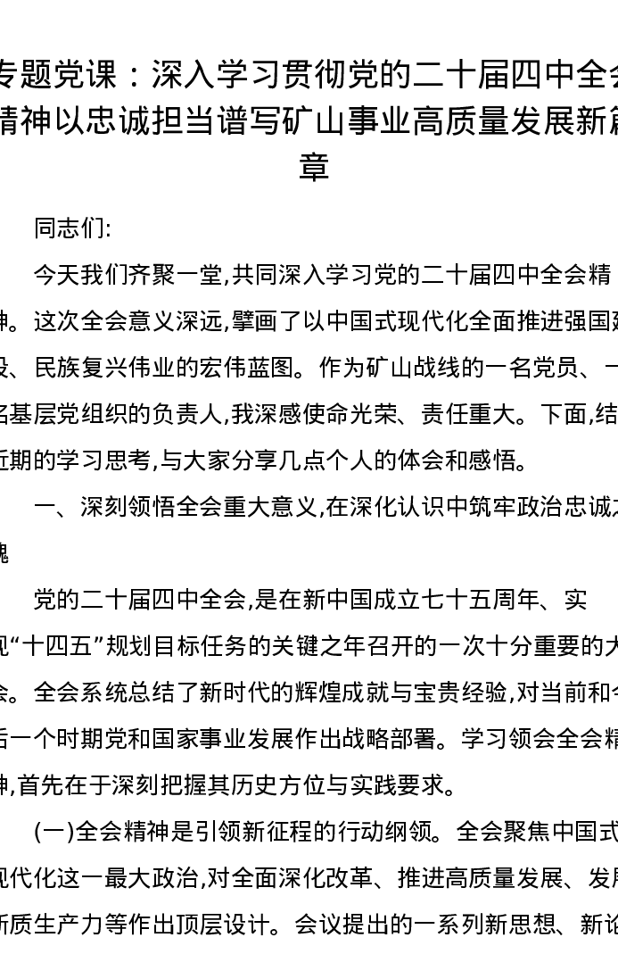 专题党课:深入学习贯彻党的二十届四中全会精神以忠诚担当谱写矿山事业高质量发展新篇章