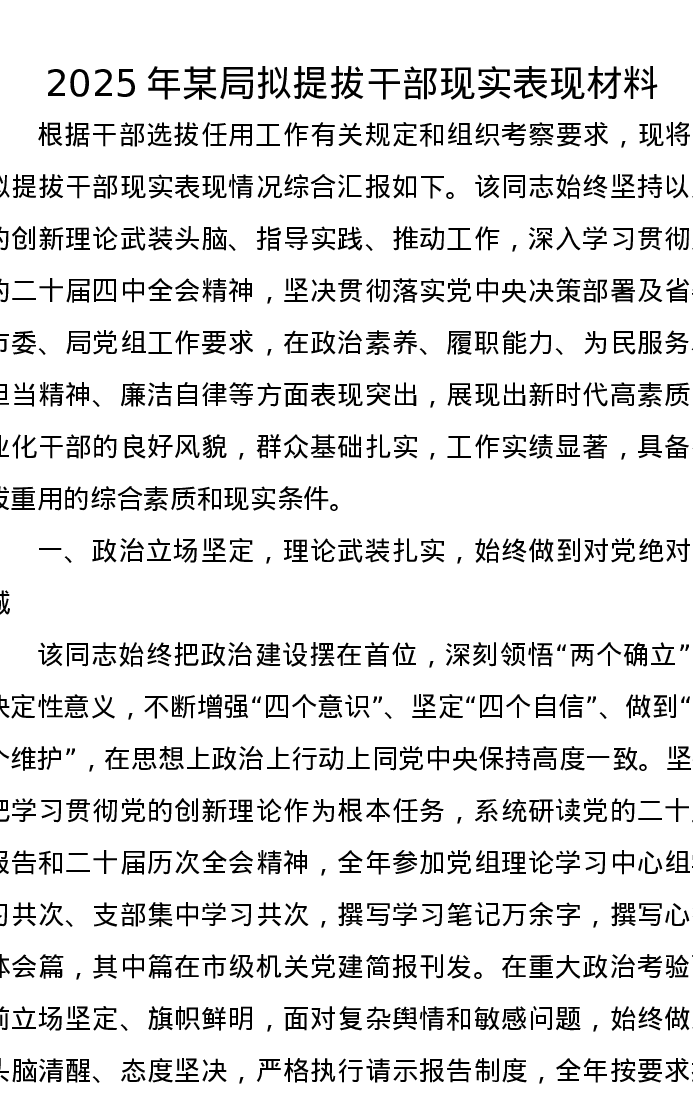 2025年某局拟提拔干部现实表现材料