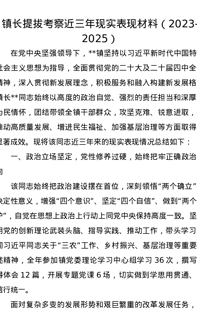 镇长提拔考察近三年现实表现材料(2023-2025)