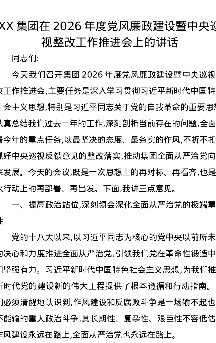 XX集团在2026年度党风廉政建设暨中央巡视整改工作推进会上的讲话