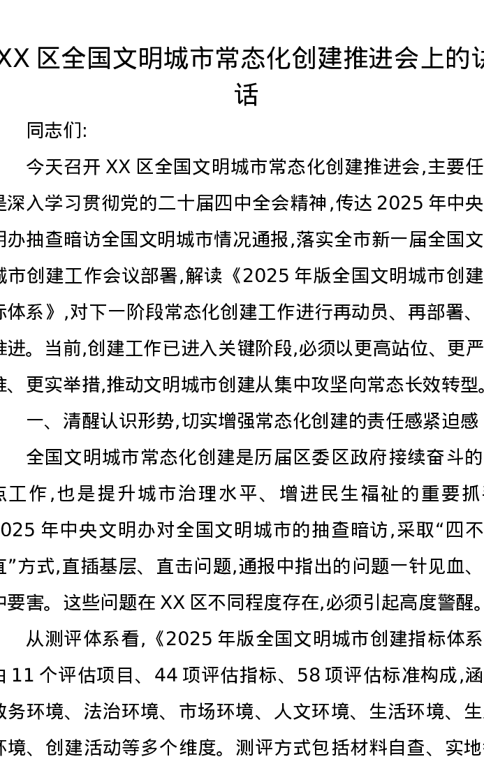 XX区全国文明城市常态化创建推进会上的讲话