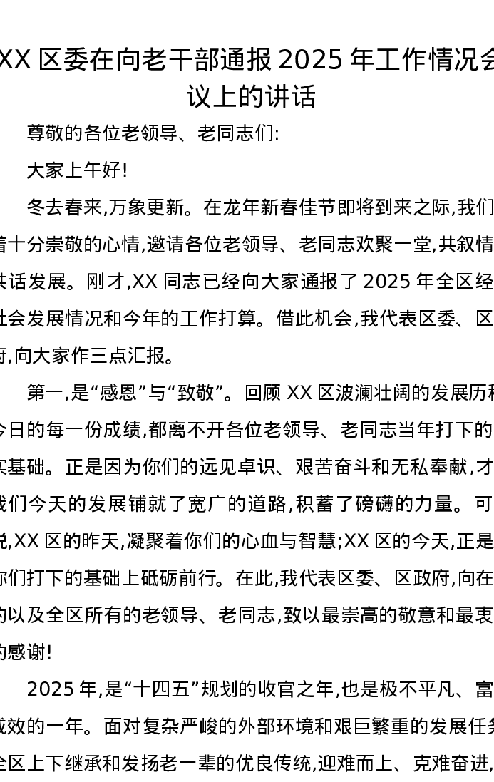 XX区委在向老干部通报2025年工作情况会议上的讲话