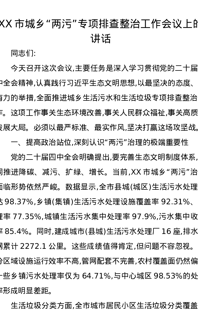 XX市城乡两污专项排查整治工作会议上的讲话
