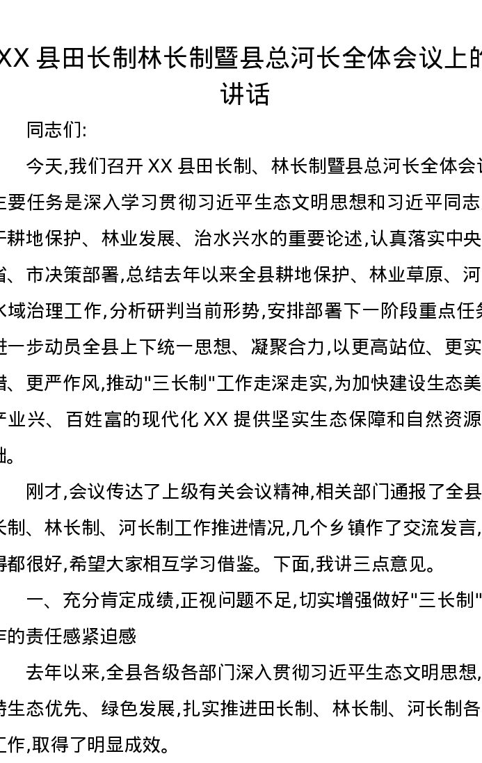 XX县田长制林长制暨县总河长全体会议上的讲话