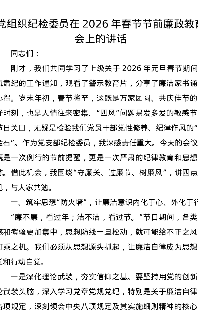 党组织纪检委员在2026年春节节前廉政教育会上的讲话