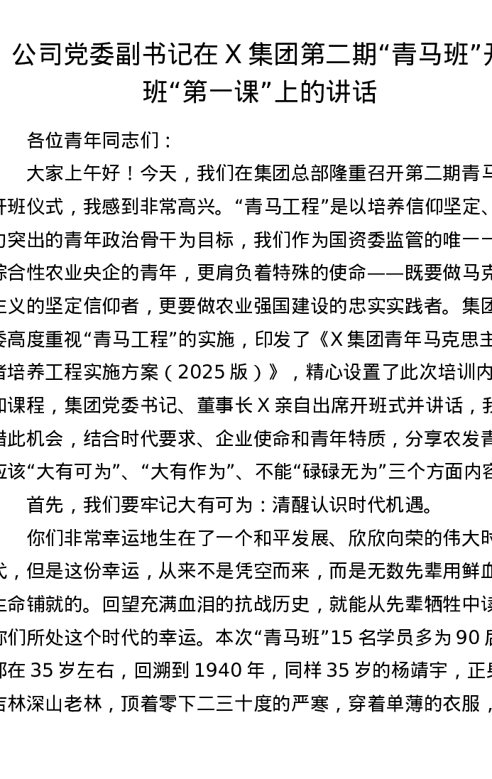 公司党委副书记在X集团第二期青马班开班第一课上的讲话