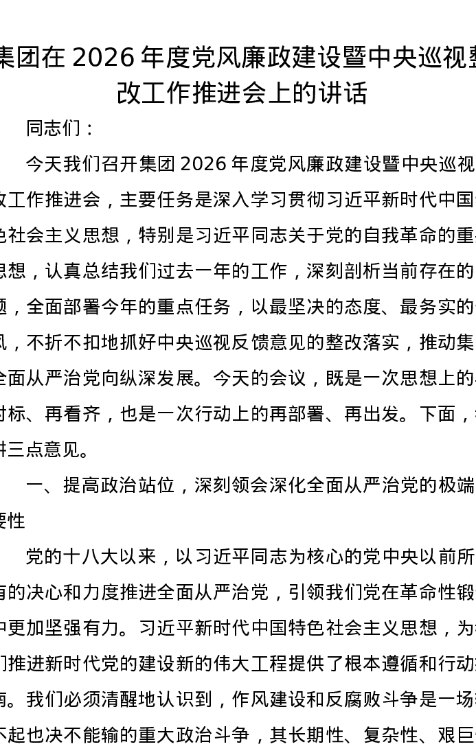 集团在2026年度党风廉政建设暨中央巡视整改工作推进会上的讲话
