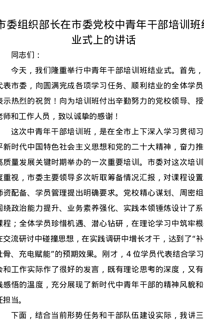 市委组织部长在市委党校中青年干部培训班结业式上的讲话