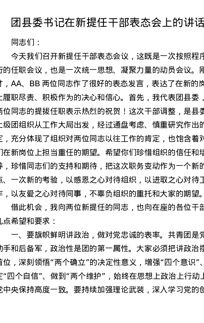 团县委书记在新提任干部表态会上的讲话(1441字)