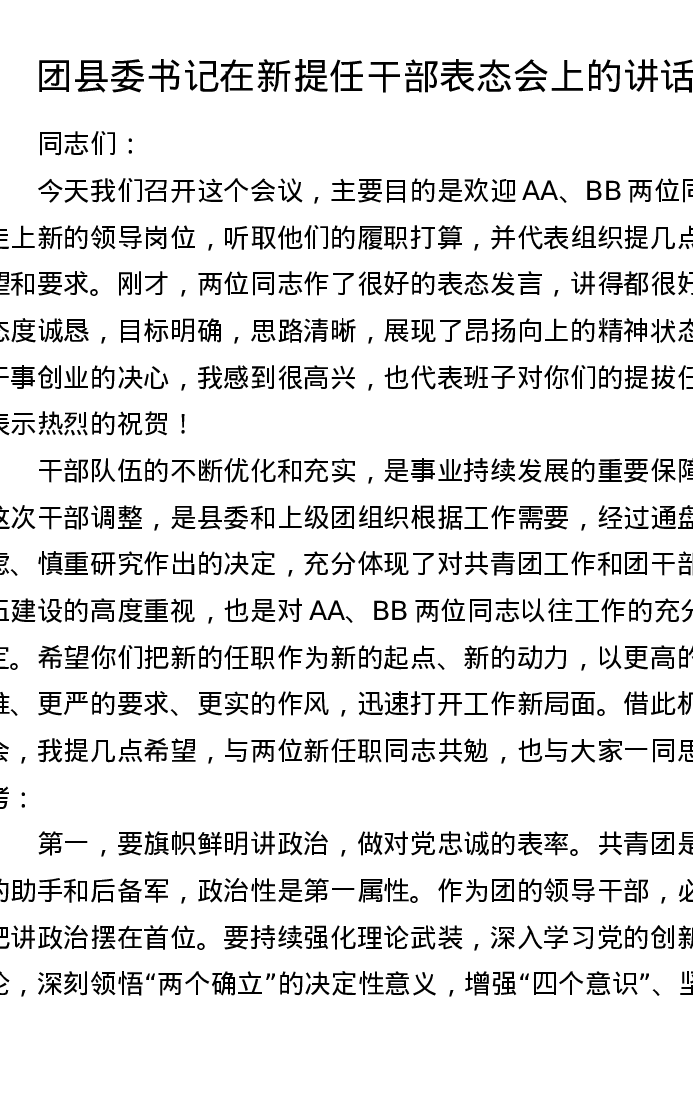 团县委书记在新提任干部表态会上的讲话(1527字)