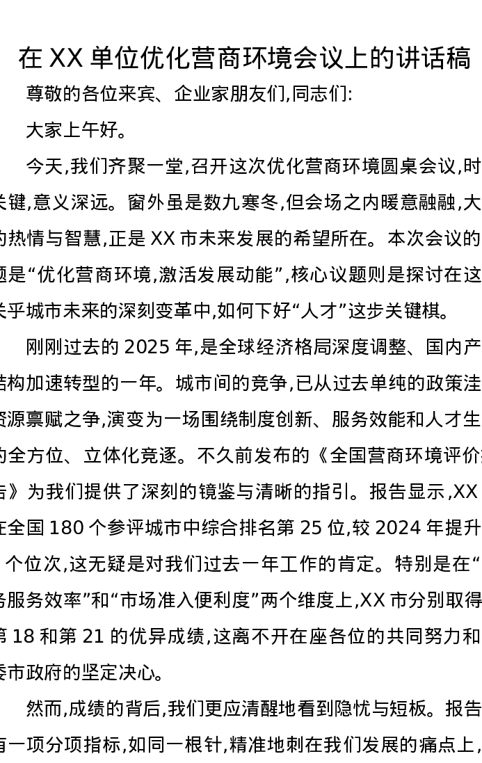 在XX单位优化营商环境会议上的讲话稿