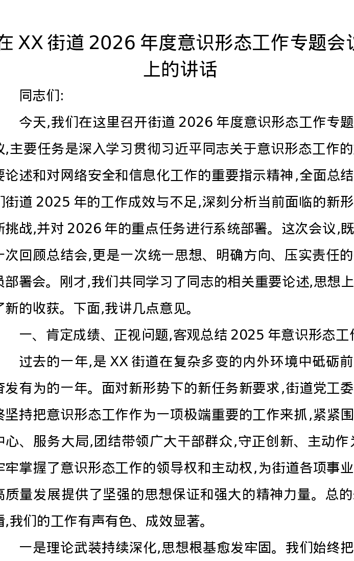 在XX街道2026年度意识形态工作专题会议上的讲话