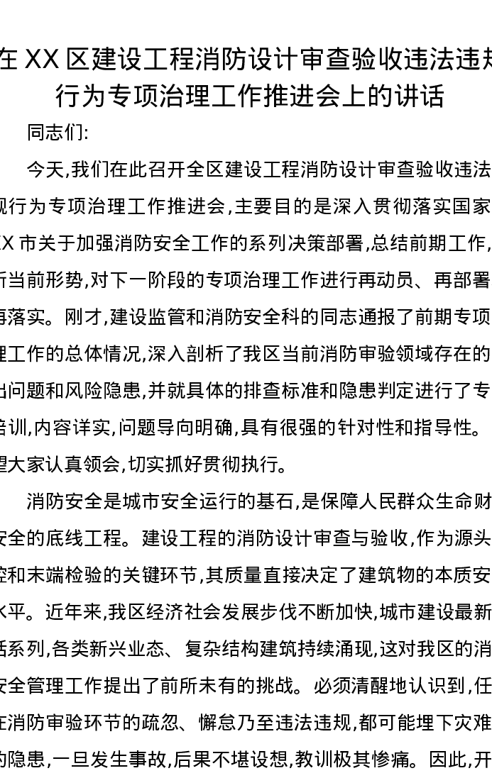 在XX区建设工程消防设计审查验收违法违规行为专项治理工作推进会上的讲话