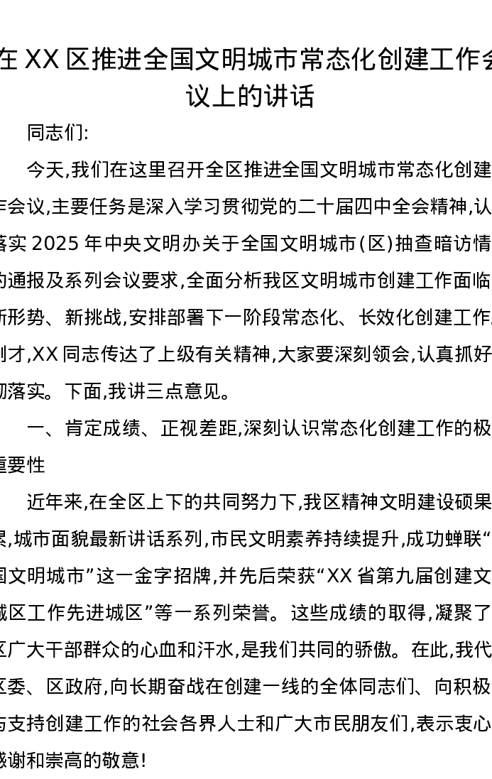 在XX区推进全国文明城市常态化创建工作会议上的讲话