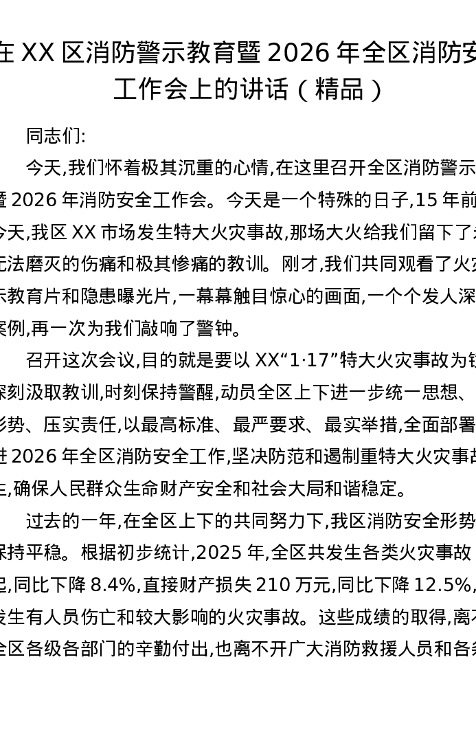 在XX区消防警示教育暨2026年全区消防安全工作会上的讲话