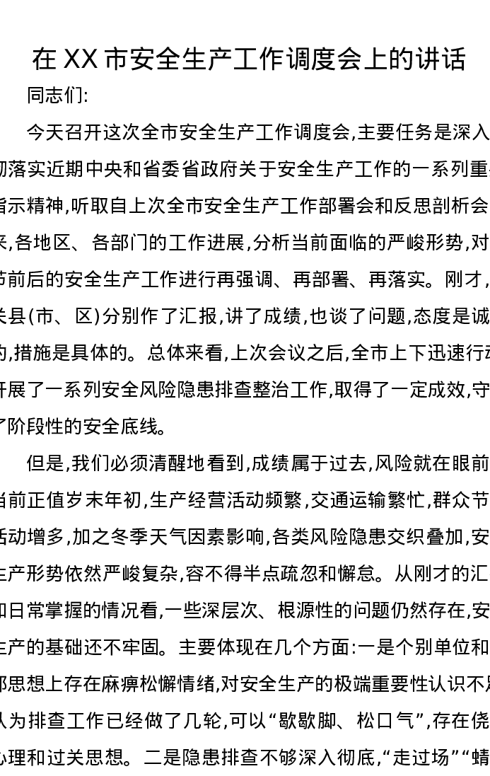 在XX市安全生产工作调度会上的讲话