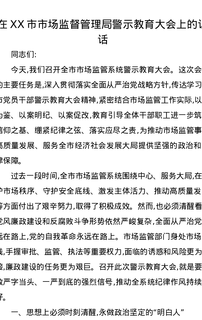 在XX市市场监督管理局警示教育大会上的讲话