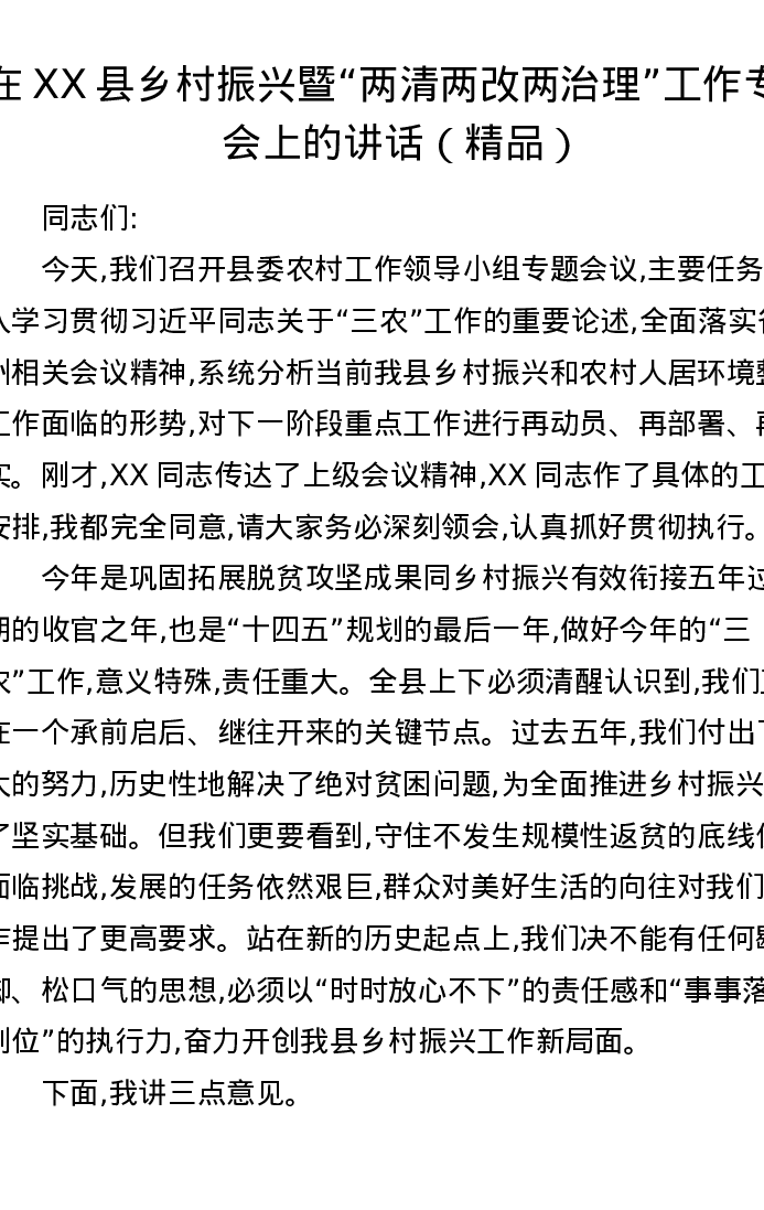 在XX县乡村振兴暨两清两改两治理工作专题会上的讲话