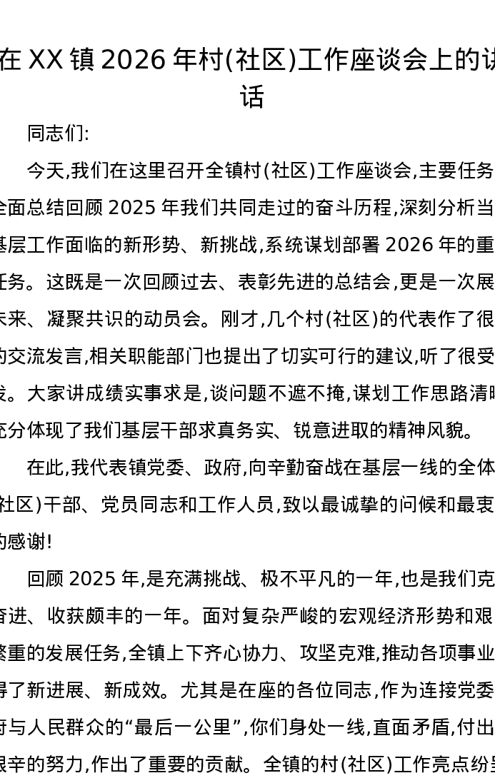 在XX镇2026年村(社区)工作座谈会上的讲话