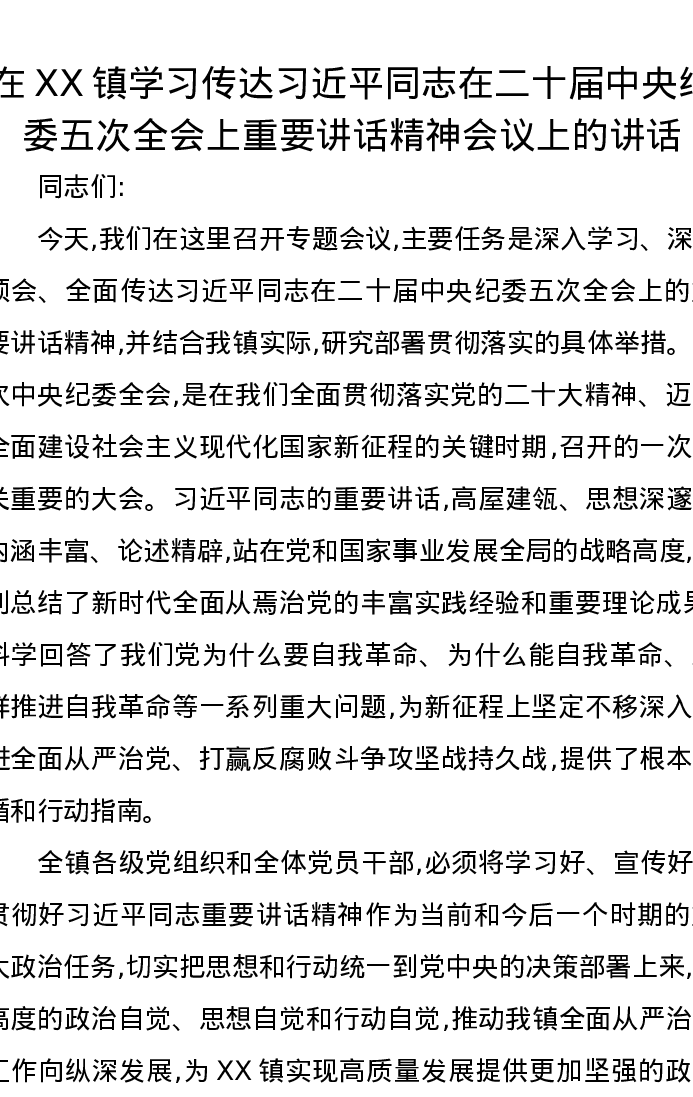 在XX镇学习传达习近平总书记在二十届中央纪委五次全会上重要讲话精神会议上的讲话