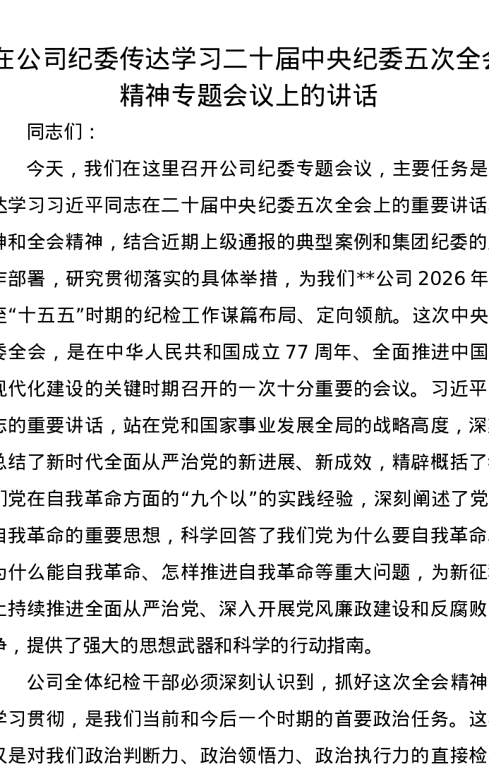 在公司纪委传达学习二十届中央纪委五次全会精神专题会议上的讲话