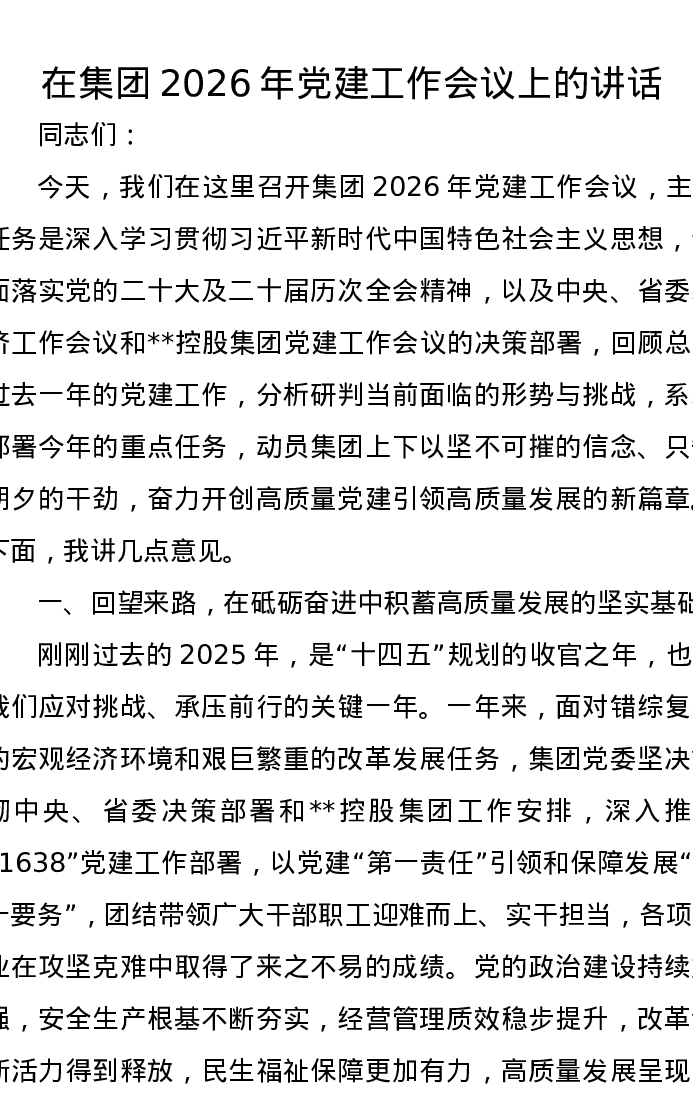 在集团2026年党建工作会议上的讲话