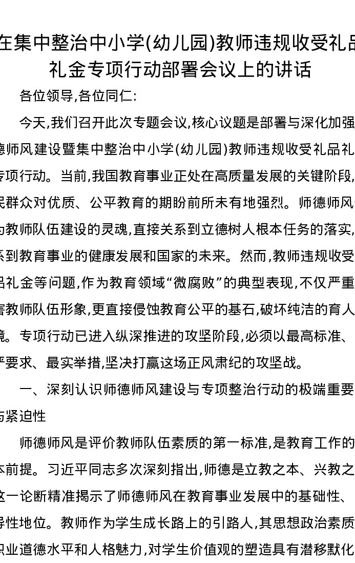在集中整治中小学(幼儿园)教师违规收受礼品礼金专项行动部署会议上的讲话
