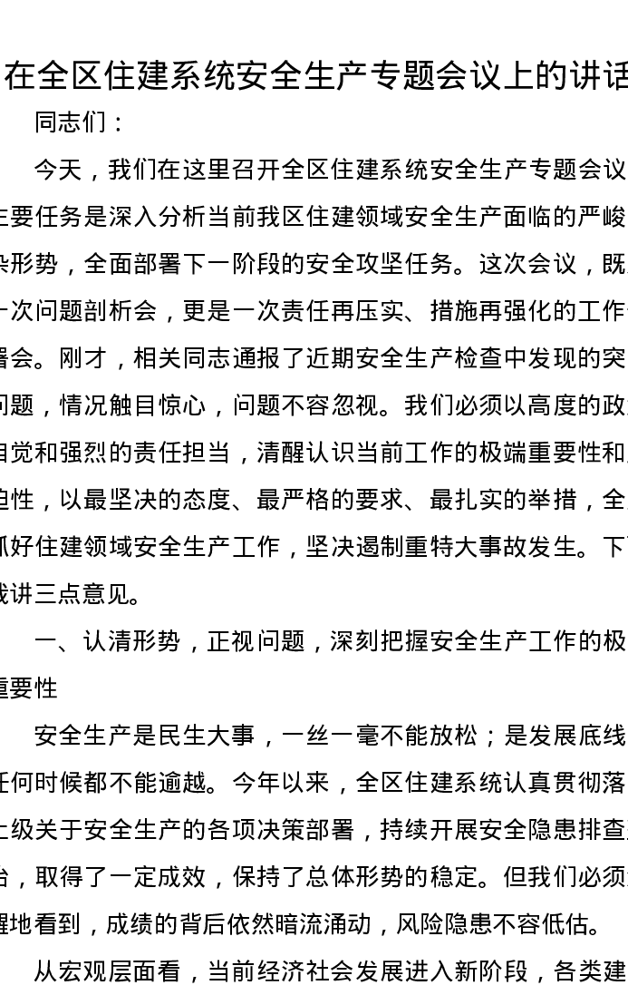 在全区住建系统安全生产专题会议上的讲话