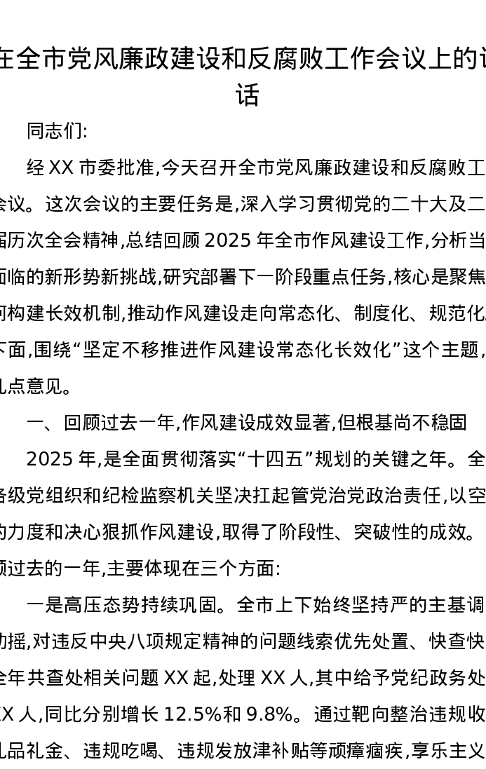 在全市党风廉政建设和反腐败工作会议上的讲话