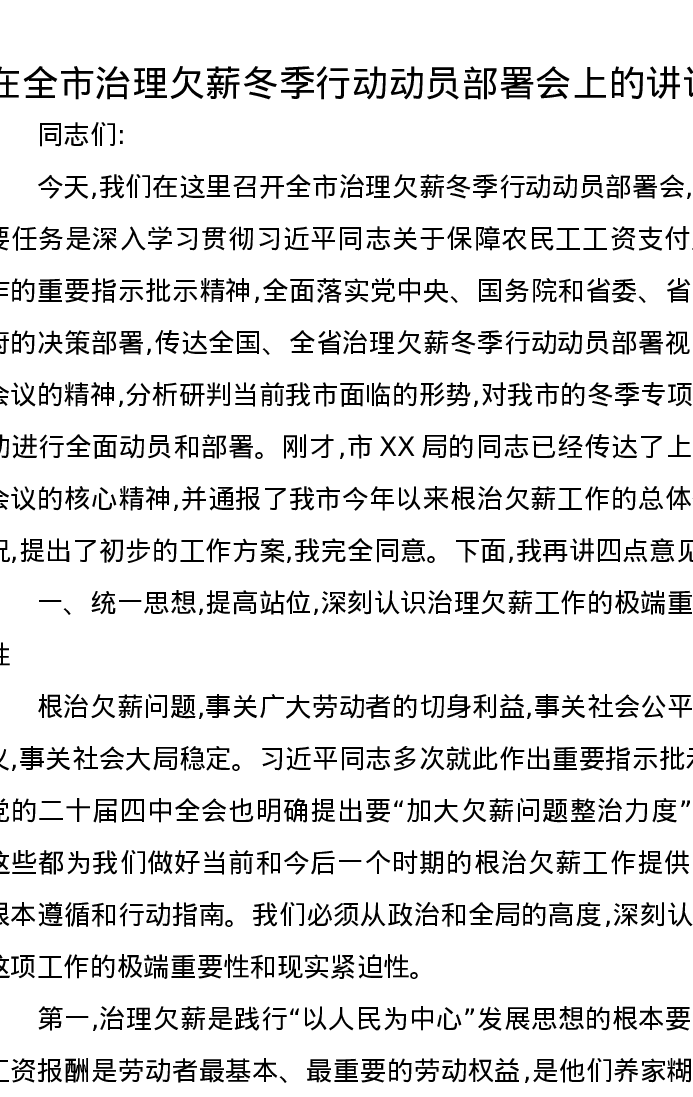 在全市治理欠薪冬季行动动员部署会上的讲话