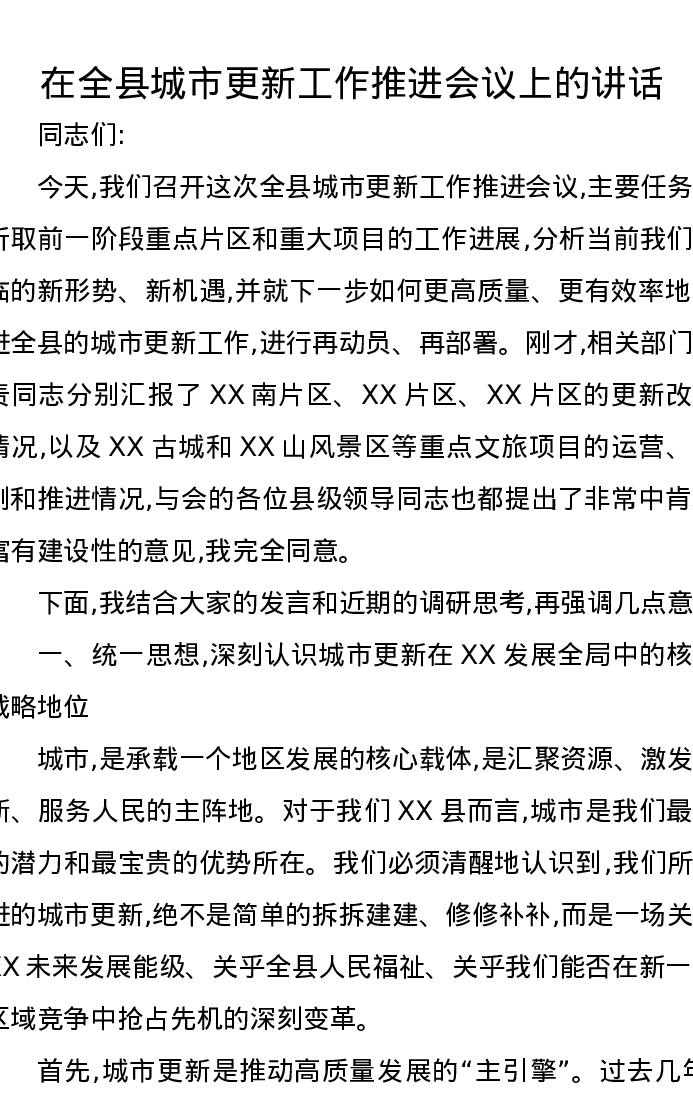 在全县城市更新工作推进会议上的讲话