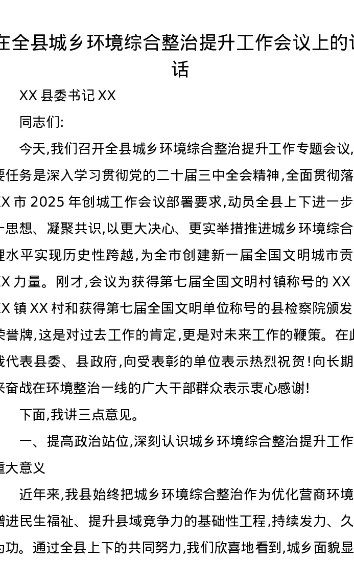 在全县城乡环境综合整治提升工作会议上的讲话