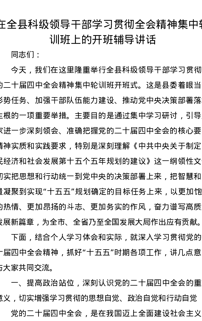 在全县科级领导干部学习贯彻全会精神集中轮训班上的开班辅导讲话