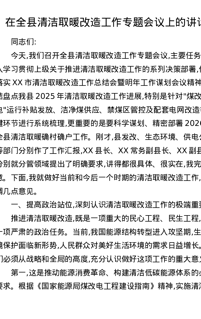 在全县清洁取暖改造工作专题会议上的讲话