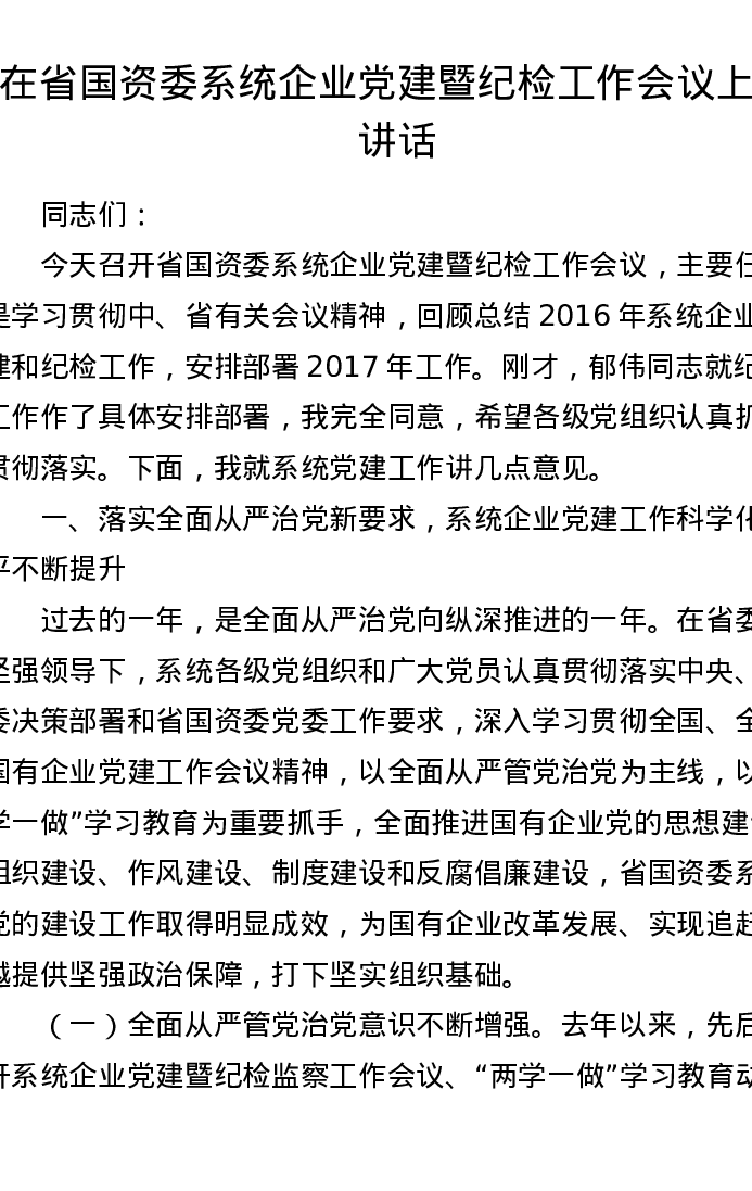 在省国资委系统企业党建暨纪检工作会议上的讲话