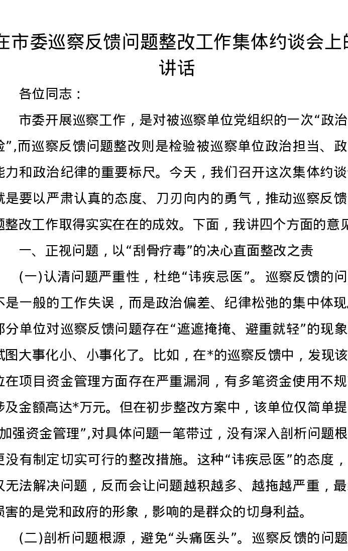 在市委巡察反馈问题整改工作集体约谈会上的讲话