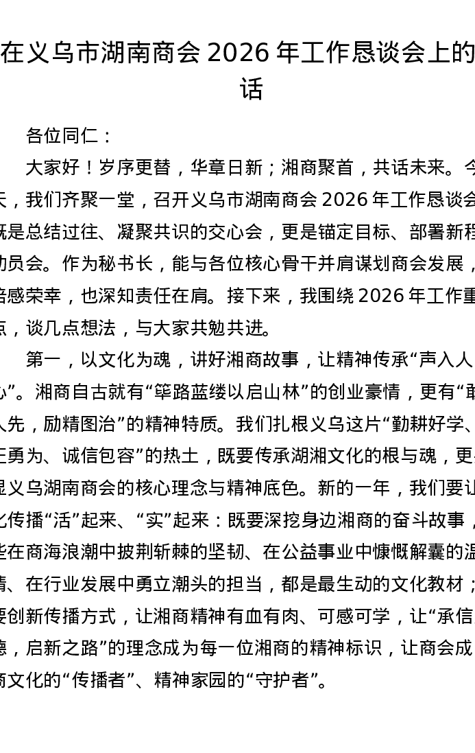 在义乌市湖南商会2026年工作恳谈会上的讲话